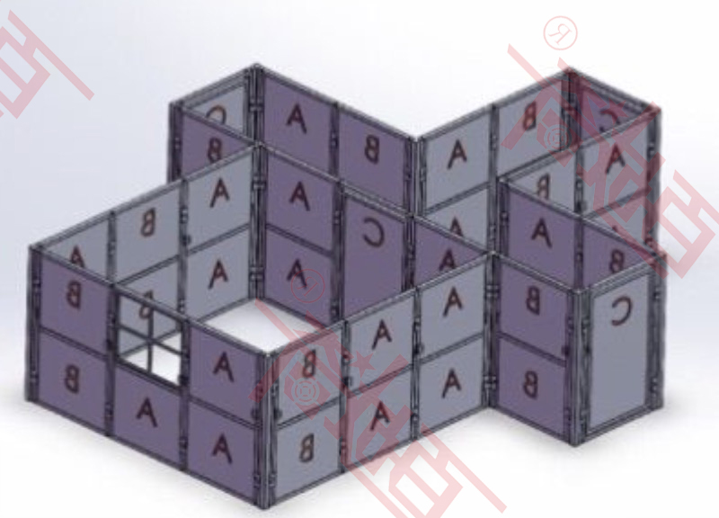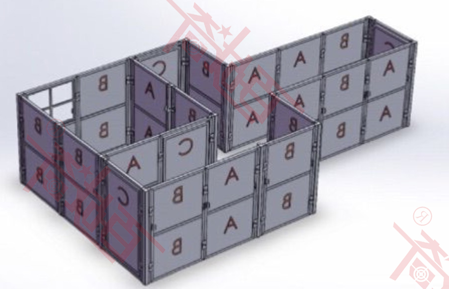如上图所示CQB快速拼接战术训练冲房的灵活组装拼接方案,一是适合非特战单位队员的日常训练需求,可灵活组建独立或附带L型、十字型走廊的房屋结构,也可根据需要自行组合其它结构。二是针对特战单位日常训练需要,可组建3至4个独立及附带构建L型、十字型走廊结构。